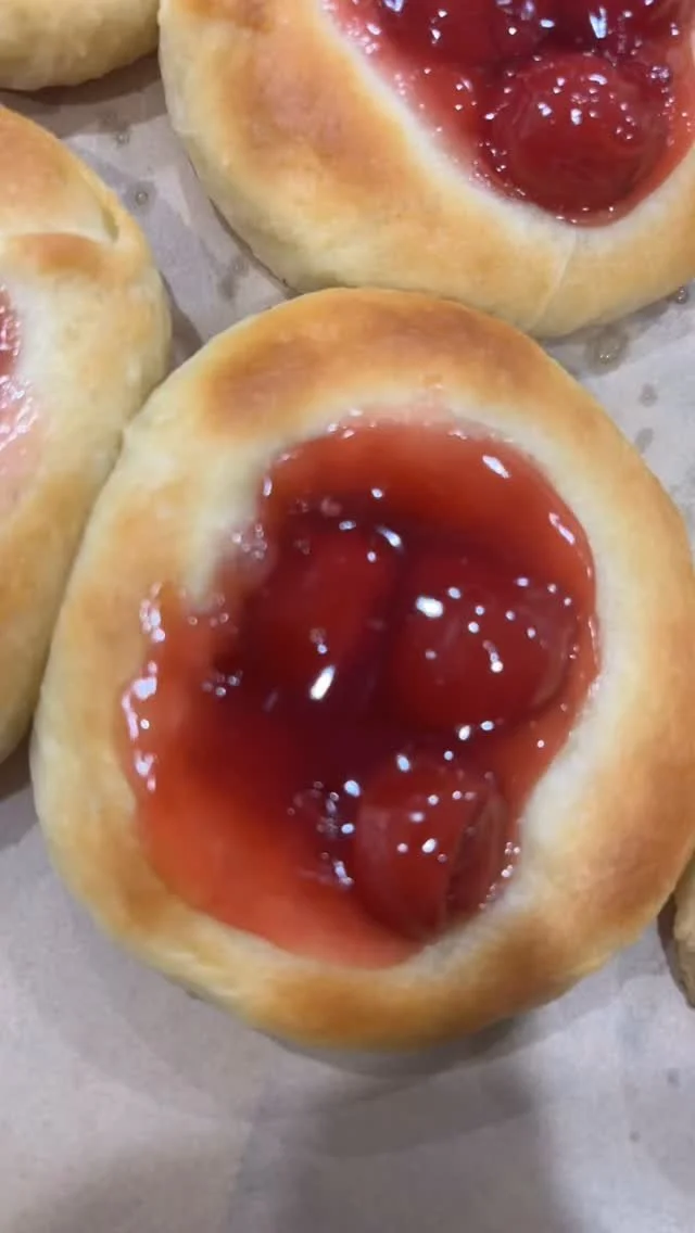 A kolache (pronounced ko-lah-chee) is a traditional Czech pastry made from a soft, sweet yeast dough and filled with a variety of fruit or poppyseed fillings. Unlike a donut, it's not fried—but baked to golden perfection.